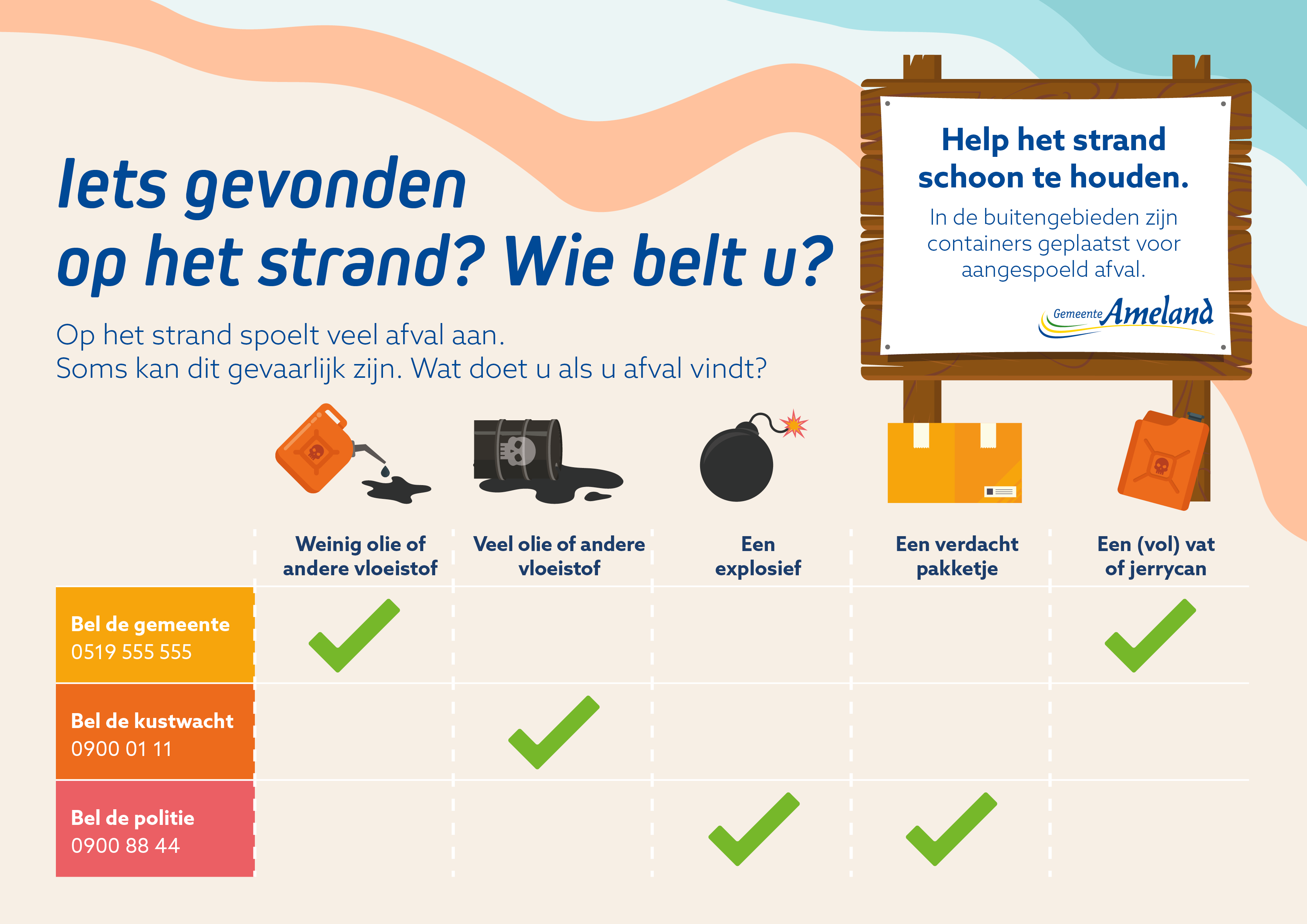 De Gemeente Ameland heeft een infographic opgesteld met de titel "Iets gevonden op het strand? Wie belt u?". Op het strand spoelt veel afval aan, wat soms gevaarlijk kan zijn. Bij het vinden van weinig olie of andere vloeistof of een (vol) vat of jerrycan, moet de gemeente gebeld worden op 0519 555 555. Voor het melden van veel olie of andere vloeistof is de kustwacht het aanspreekpunt op 0900 01 11. Bij het vinden van een explosief of een verdacht pakketje dient men de politie te bellen op 0900 88 44. De gemeente roept daarnaast op om het strand schoon te houden en heeft containers geplaatst voor aangespoeld afval in de buitengebieden.